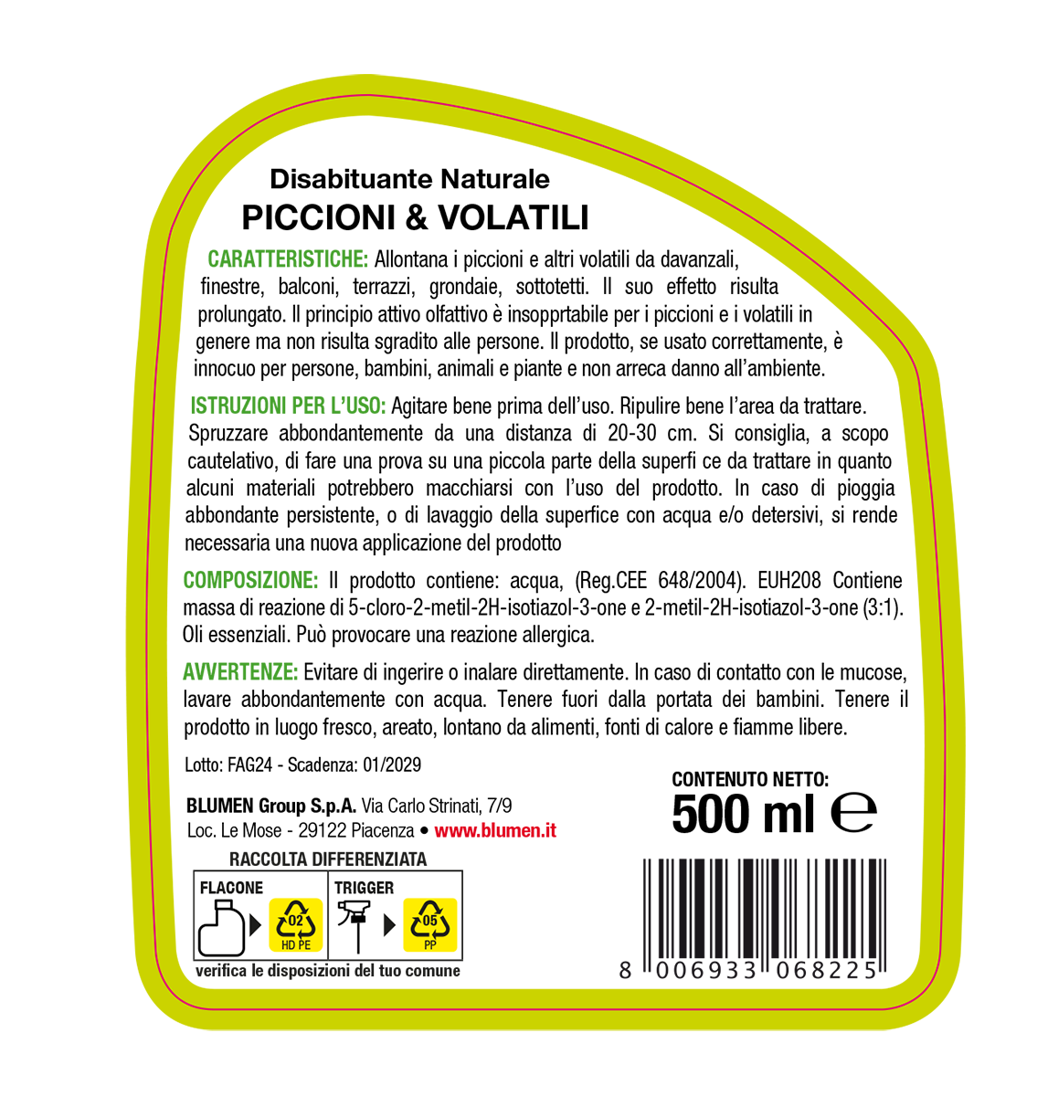 Allontana i piccioni e altri volatili da davanzali, finestre, balconi, terrazzi, grondaie, sottotetti. Il suo effetto risulta prolungato. Il principio attivo olfattivo è insopprtabile per i piccioni e i volatili in genere ma non risulta sgradito alle persone. Il prodotto, se usato correttamente, è innocuo per persone, bambini, animali e piante e non arreca danno all’ambiente.